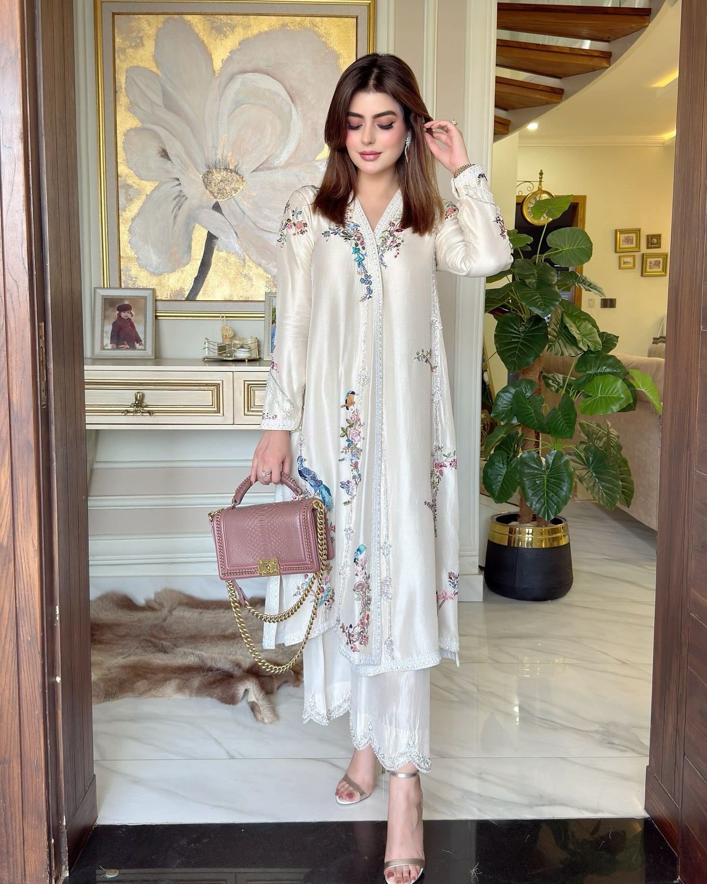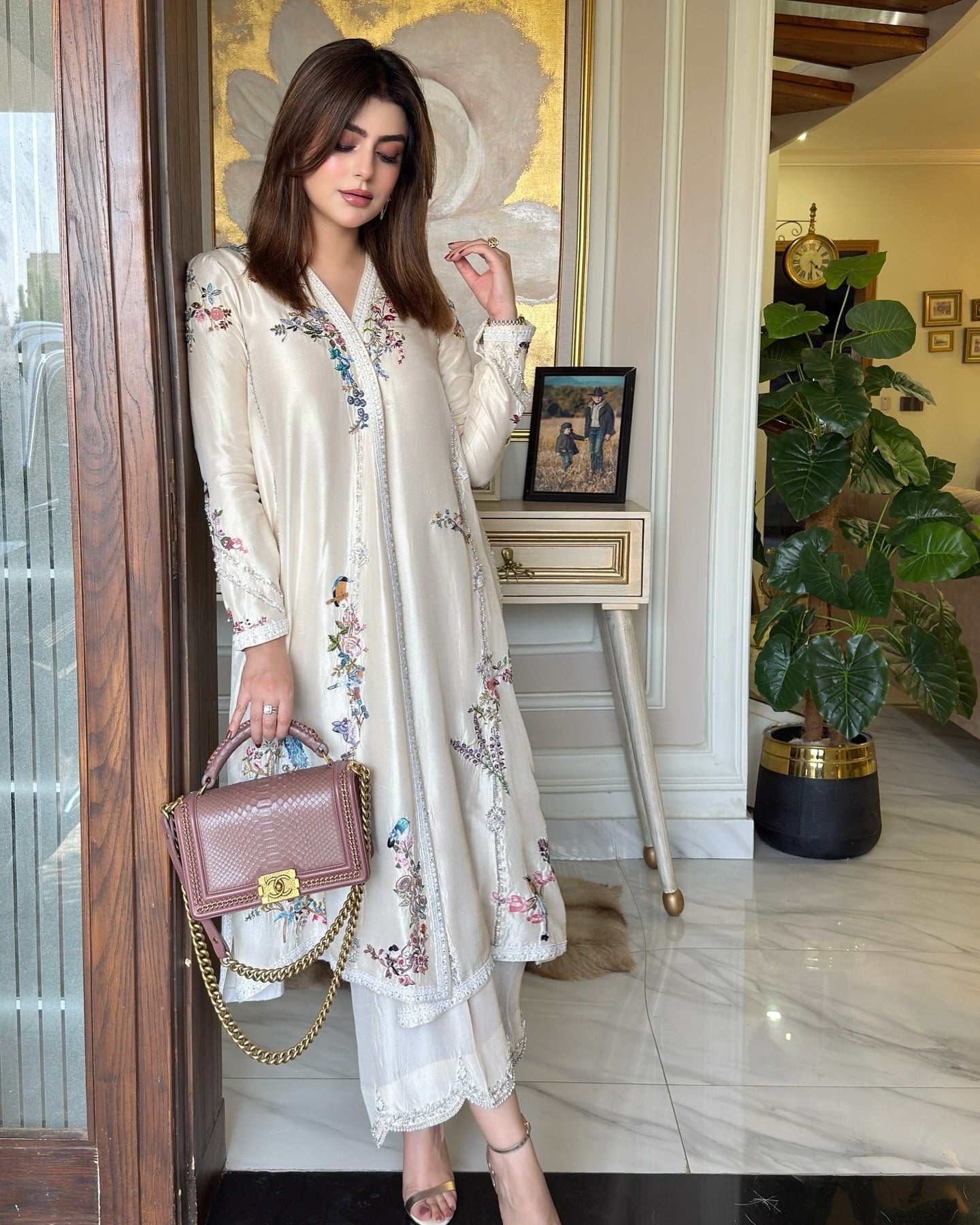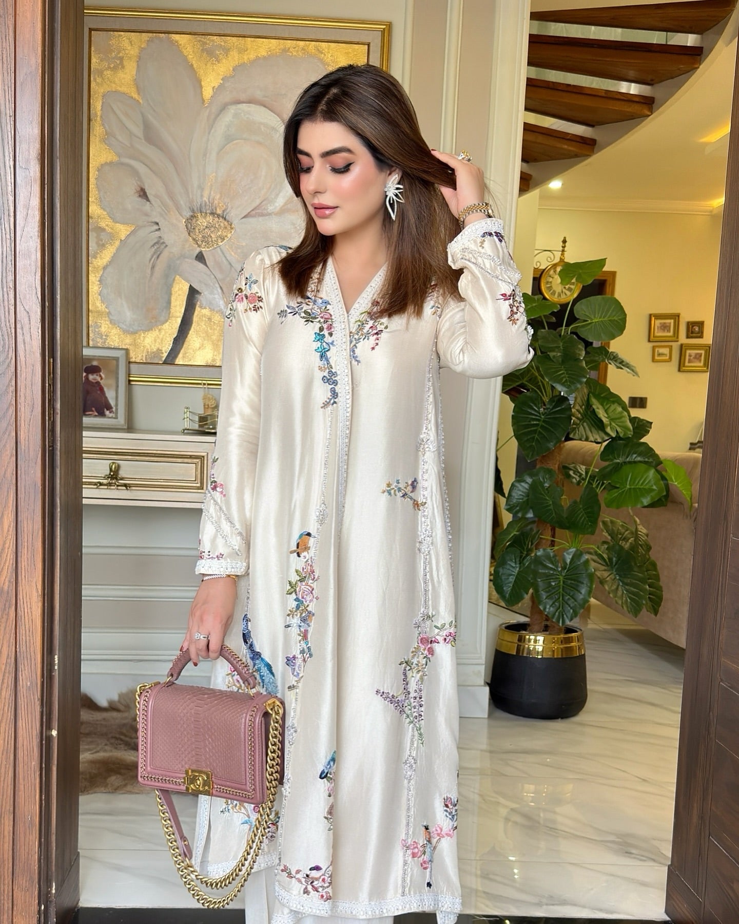 Soft White Chogha With Beautifully Colored Finely Hand-Embroidered